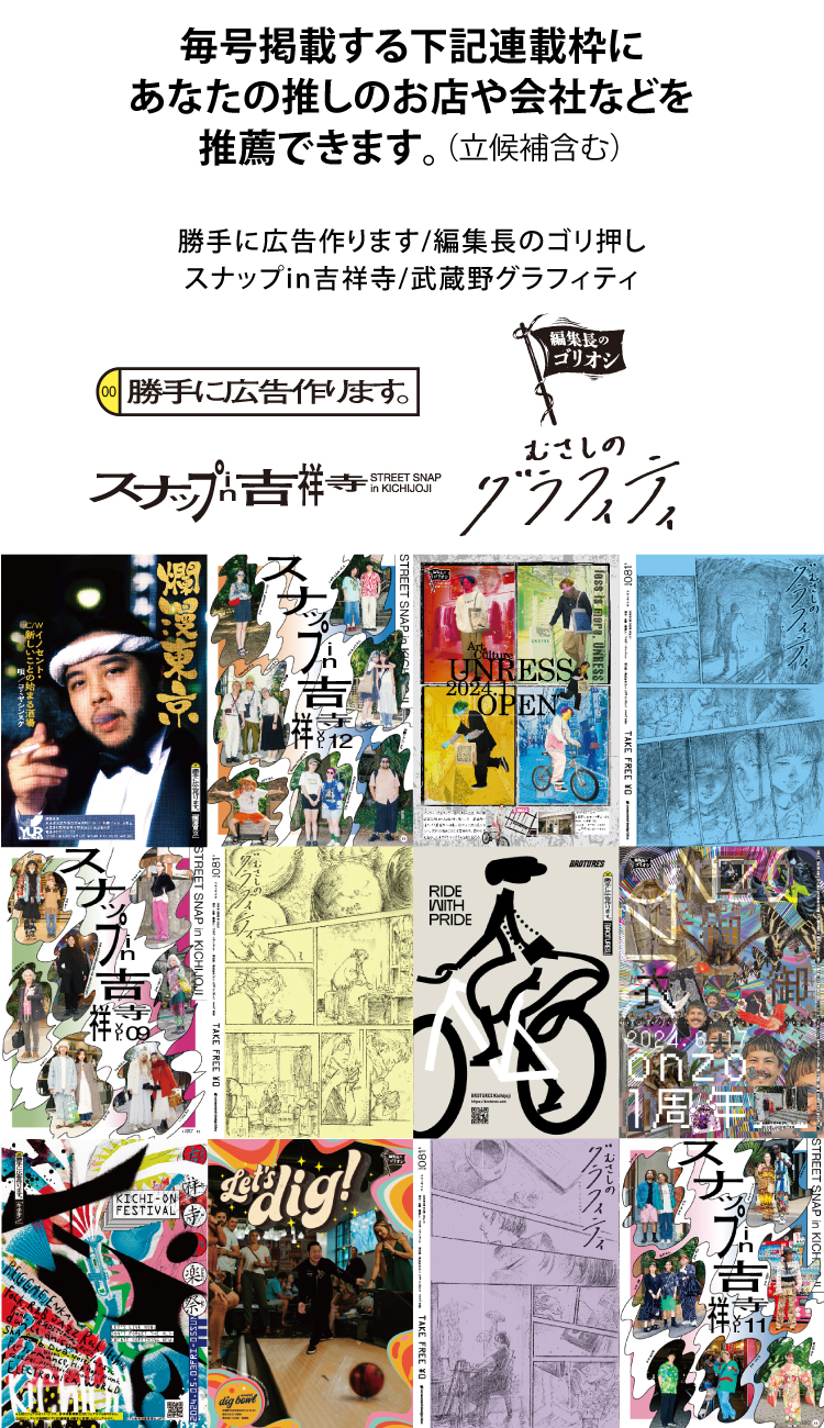 ![]() | ![]() 好きなお店を 【連作枠】 勝手に広告作ります/編集長のゴリ押し/むさしのグラフィティ/吉祥寺フリークス/ムサシノ世界一周/スナップin吉祥寺 のどれか1つに推薦でき、取材にも同行できる |