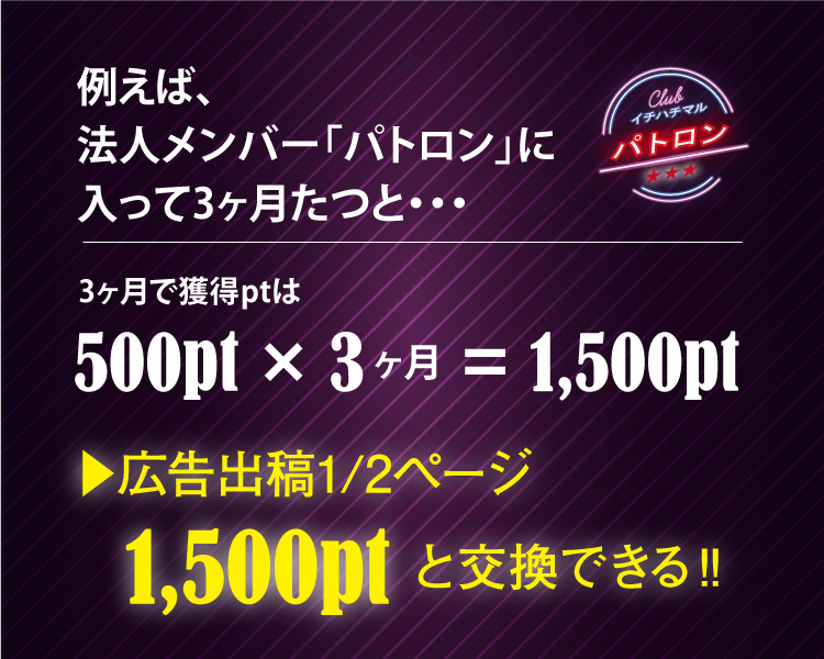 | ③広告出稿1/2ページ・・・・・・・・ 1,500pt | ⑧写真撮影・・・・・・・・・・・・ 500pt~ |